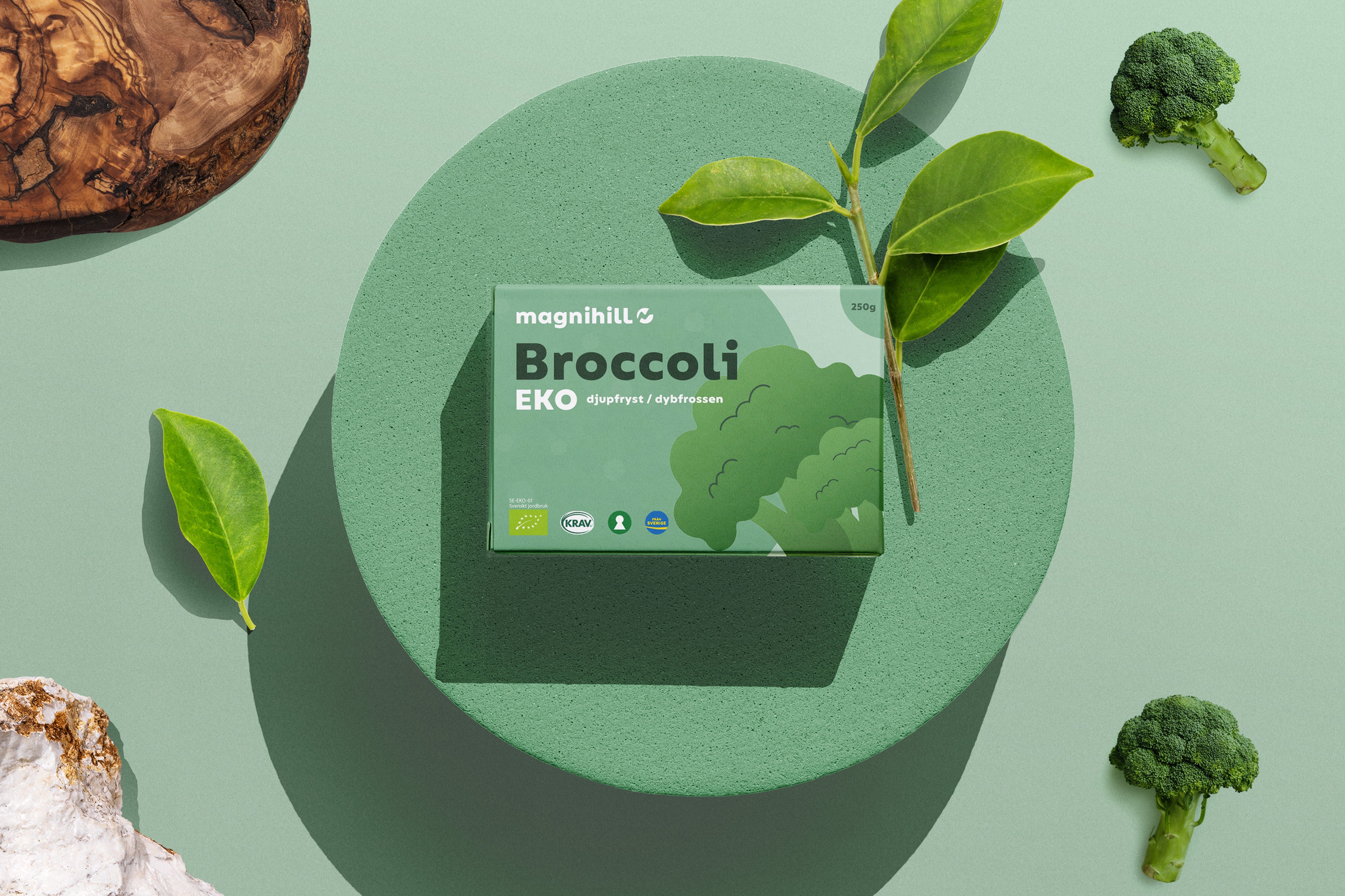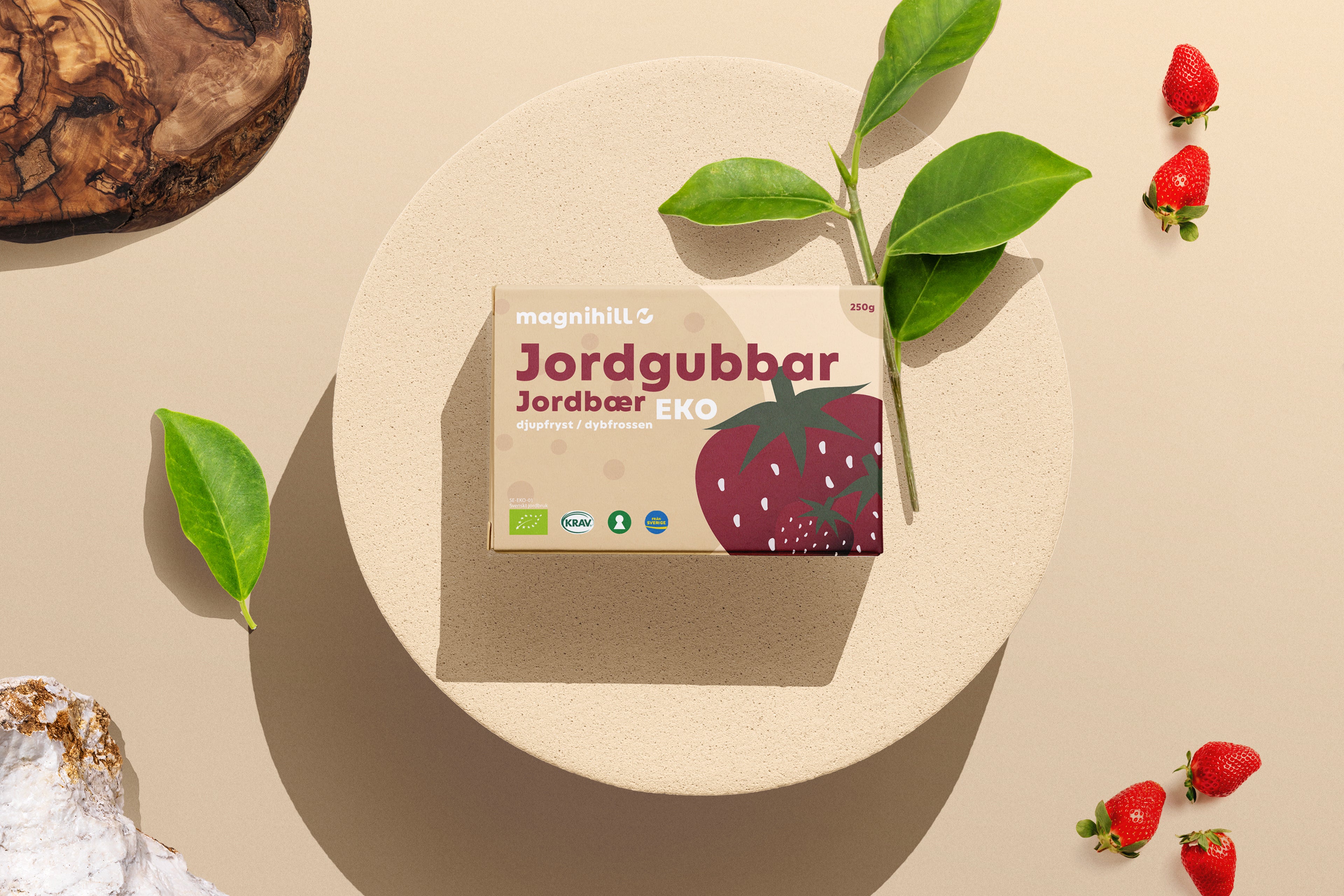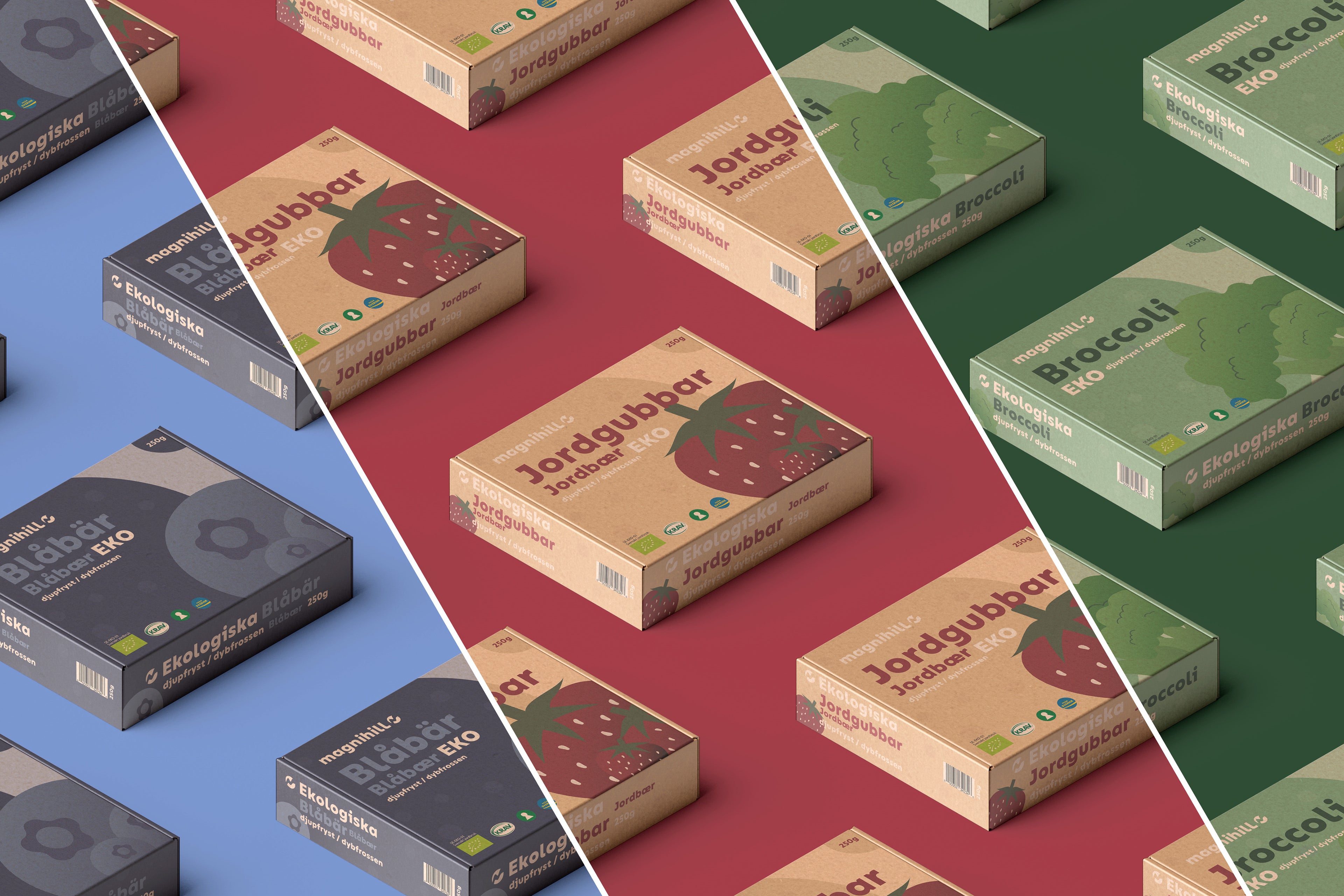 I det här projektet valde jag att göra en redesign av logotypen och tre produktförpackningar för Magnihill som är ett ett svenskt familjeföretag som odlar, producerar och importerar frysta produkter från växtriket, med stort fokus på ekologiskt.